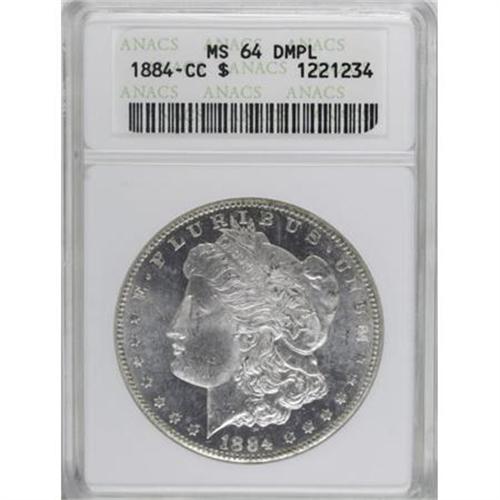<B>1884-CC $1 MS64 Deep Mirror Prooflike ANACS.</B></I> NGC Census: (551/238). PCGS Population (1167/615). Numismedia Wsl. Price for NGC/PCGS coin in MS64: $510. (#97153)<BR><BR><b>Shipping:</b> Coins & Currency (<a target="_blank" href="http://www.heritageauctions.com/common/shipping.php">view shipping information</a>)