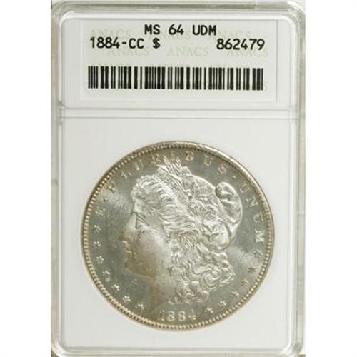 <B>1884-CC $1 MS64 Deep Mirror Prooflike ANACS.</B></I> NGC Census: (551/238). PCGS Population (1174/631). Numismedia Wsl. Price for NGC/PCGS coin in MS64: $510. (#97153)<BR><BR><b>Shipping:</b> Coins & Currency (<a target="_blank" href="http://www.heritageauctions.com/common/shipping.php">view shipping information</a>)