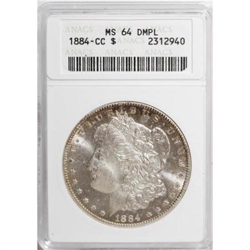 <B>1884-CC $1 MS64 Deep Mirror Prooflike ANACS.</B></I> NGC Census: (559/238). PCGS Population (1175/629). Numismedia Wsl. Price for NGC/PCGS coin in MS64: $510. (#97153)<BR><BR><b>Shipping:</b> Coins & Currency (<a target="_blank" href="http://www.heritageauctions.com/common/shipping.php">view shipping information</a>)