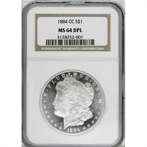 <B>1884-CC $1 MS64 Deep Mirror Prooflike NGC.</B></I> NGC Census: (564/240). PCGS Population (1191/641). Numismedia Wsl. Price for NGC/PCGS coin in MS64: $510. (#97153)<BR><BR><b>Shipping:</b> Coins & Currency (<a target="_blank" href="http://www.heritageauctions.com/common/shipping.php">view shipping information</a>)