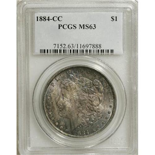 <B>1884-CC $1 MS63 PCGS.</B></I> PCGS Population (7565/18669). NGC Census: (3120/9301). Mintage: 1,136,000. Numismedia Wsl. Price for NGC/PCGS coin in MS63: $185. (#7152)<BR><BR><b>Shipping:</b> Coins & Currency (<a target="_blank" href="http://www.heritageauctions.com/common/shipping.php">view shipping information</a>)