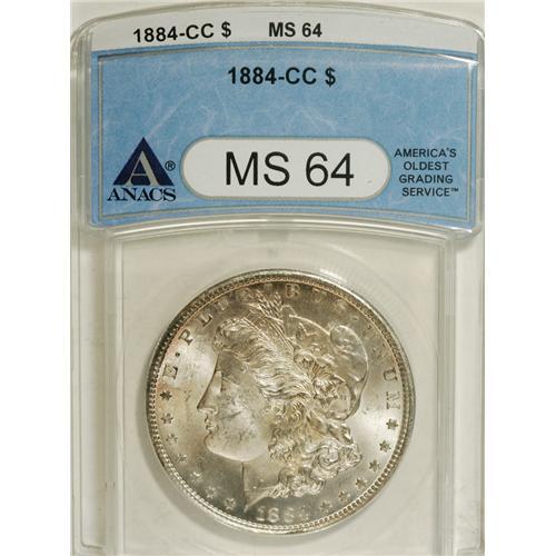 <B>1884-CC $1 MS64 ANACS.</B></I> NGC Census: (5327/3929). PCGS Population (11474/7138). Mintage: 1,136,000. Numismedia Wsl. Price for NGC/PCGS coin in MS64: $200. (#7152)<BR><BR><b>Shipping:</b> Coins & Currency (<a target="_blank" href="http://www.heritageauctions.com/common/shipping.php">view shipping information</a>)