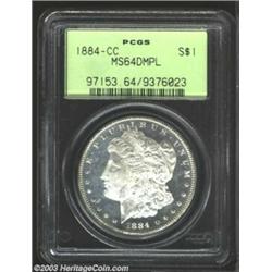 <TR><TD width="100%"><TABLE cellSpacing=1 cellPadding=3 width="100%" border=0><TBODY><TR><TD width="100%" bgColor=#79735c><FONT face=arial color=#ffffff size=3><B>Description</B> </FONT></TD></TR><TR><TD width="100%" bgColor=#ffffff><FONT face=arial size=2><B>1884-CC $1 MS64 Deep Mirror Prooflike PCGS.</B></I> The frosty white devices are attractively contrasted against hazy, highly reflective fields, which exhibit an underlying bluish-gray tint. There are a moderate number of scratchy abrasions on each side. </FONT></TD></TR></TBODY></TABLE></TD></TR></TBODY></TABLE><BR><A name=PricesRealized></A><TABLE cellSpacing=0 cellPadding=0 width="100%" bgColor=#000000 border=0><TBODY><TR><TD width="100%"><TABLE cellSpacing=1 cellPadding=3 width="100%" border=0><TBODY><TR><TD width="100%" bgColor=#79735c><A name=PR><FONT face=arial color=#ffffff size=3><B>Previous Prices from Heritage Auctions</B> </FONT></A></TD></TR><TR><TD bgColor=#f6f6ed><TABLE cellSpacing=0 cellPadding=0 width="100%" border=1><TBODY><TR><TD align=middle width="33%"><B>Date</B></TD><TD align=middle width="33%"><B>Service</B></TD><TD align=middle width="33%"><B>Price</B></TD></TR><TR bgColor=whitesmoke><TD width="33%"><B>11/25/2002</B></TD><TD width="33%">PCGS</TD><TD width="33%">$310.50</TD></TR><TR bgColor=whitesmoke><TD width="33%"><B>10/02/2001</B></TD><TD width="33%">PCGS</TD><TD width="33%">$125.00</TD></TR><TR bgColor=whitesmoke><TD width="33%"><B>04/05/2001</B></TD><TD width="33%">PCGS</TD><TD width="33%">$195.50</TD></TR><TR bgColor=whitesmoke><TD width="33%"><B>10/04/2000</B></TD><TD width="33%">PCGS</TD><TD width="33%">$126.50</TD></TR><TR bgColor=whitesmoke><TD width="33%"><B>10/31/2000</B></TD><TD width="33%">PCGS</TD><TD width="33%">$140.00</TD></TR><TR bgColor=whitesmoke><TD width="33%"><B>05/06/2000</B></TD><TD width="33%">PCGS</TD><TD width="33%">$172.50</TD></TR><TR bgColor=whitesmoke><TD width="33%"><B>10/10/2000</B></TD><TD width="33%">PCGS</TD><TD width="33%">$155.00</TD></TR><TR bgColor=whitesmoke><TD width="33%"><B>11/18/2000</B></TD><TD width="33%">PCGS</TD><TD width="33%">$230.00</TD></TR><TR bgColor=whitesmoke><TD width="33%"><B>11/21/2000</B></TD><TD width="33%">PCGS</TD><TD width="33%">$155.00</TD></TR><TR bgColor=whitesmoke><TD width="33%"><B>03/03/2003</B></TD><TD width="33%">PCGS</TD><TD width="33%">$264.50</TD></TR><TR bgColor=whitesmoke><TD width="33%"><B>03/01/2003</B></TD><TD width="33%">PCGS</TD><TD width="33%">$373.75</TD></TR><TR bgColor=whitesmoke><TD width="33%"><B>11/17/2001</B></TD><TD width="33%">NGC</TD><TD width="33%">$138.00</TD></TR><TR bgColor=whitesmoke><TD width="33%"><B>05/08/2001</B></TD><TD width="33%">NGC</TD><TD width="33%">$145.00</TD></TR><TR bgColor=whitesmoke><TD width="33%"><B>11/18/2000</B></TD><TD width="33%">NGC</TD><TD width="33%">$126.50</TD></TR><TR bgColor=whitesmoke><TD width="33%"><B>09/30/2002</B></TD><TD width="33%">ANACS</TD><TD width="33%">$161.00</TD></TR><TR bgColor=whitesmoke><TD width="33%"><B>04/28/2002</B></TD><TD width="33%">ANACS</TD><TD width="33%">$143.75</TD></TR><TR bgColor=whitesmoke><TD width="33%"><B>08/05/2001</B></TD><TD width="33%">ANACS</TD><TD width="33%">$161.00</TD></TR><TR bgColor=whitesmoke><TD width="33%"><B>11/14/2000</B></TD><TD width="33%">ANACS</TD><TD width="33%">$155.00</TD></TR></TBODY></TABLE></TD></TR><TR><TD bgColor=#ffffff><FONT face=arial size=1 ?>PLEASE NOTE: All prices realized reflect the final hammer price PLUS the buyer's premium in auctions that charge a buyer's premium. Each item has a notation at the top of the listing indicating whether that lot included a buyer's premium. Example: A item that sells with a final hammer price of $100 and a 20% buyer's premium will display with a price realized of $120. All information listed is intended to be as accurate as possible, but errors are possible. Please use this guide carefully and inform us of any inaccuracies. </FONT></TD></TR></TBODY></TABLE></TD></TR></TBODY></TABLE><BR><TABLE cellSpacing=0 cellPadding=0 width="100%" bgColor=#000000 border=0><TBODY><TR><TD width="100%"><TABLE cellSpacing=1 cellPadding=3 width="100%" border=0><TBODY><TR><TD width="100%" bgColor=#79735c colSpan=6><FONT face=arial color=#ffffff size=3><B>Price Guide*</B> </FONT></TD></TR><TR bgColor=#f6f6ed><TD align=middle><B>Grade</B> </TD><TD align=middle><B>Coin World<BR>(Trends)</B> </TD><TD align=middle><B>Numismedia<BR>Retail</B> </TD><TD align=middle><B>Numismedia<BR>Wholesale</B> </TD><TD align=middle><B>Coin<BR>Universe</B> </TD><TD align=middle><B>Heritage<BR>Value Index</B> </TD></TR><TR bgColor=#ffffff><TD align=middle>63</TD><TD align=right>$165.00</TD><TD align=right>$165.00</TD><TD align=right>$132.00</TD><TD align=right>$135.00</TD><TD align=right>$122.38</TD></TR><TR style="FONT-WEIGHT: bold" bgColor=#cccfdd><TD align=middle>64</TD><TD align=right>$225.00</TD><TD align=right>$245.00</TD><TD align=right>$196.00</TD><TD align=right>$225.00</TD><TD align=right>$220.56</TD></TR><TR bgColor=#ffffff><TD align=middle>65</TD><TD align=right>$1,000.00</TD><TD align=right>$780.00</TD><TD align=right>$625.00</TD><TD align=right>$550.00</TD><TD align=right>$527.00</TD></TR><TR bgColor=#ffffff><TD colSpan=6><FONT size=1>*All information listed is intended to be as accurate as possible, but errors are possible. No item may be returned or refused based on this information which is provided as a service to our customers. You should contact each pricing source directly to determine the accuracy of this information. </FONT></TD></TR></TBODY></TABLE></TD></TR></TBODY></TABLE><BR><TABLE cellSpacing=0 cellPadding=0 width="100%" bgColor=#000000 border=0><TBODY><TR><TD width="100%"><TABLE cellSpacing=1 cellPadding=3 width="100%" border=0><TBODY><TR><TD width="100%" bgColor=#79735c><FONT face=arial color=#ffffff size=3><B>Population Guide</B> </FONT></TD></TR><TR bgColor=#ffffff><TD align=middle><!-- Begin Output of Population Grid--><TABLE cellSpacing=0 cellPadding=0 width="100%" border=0><TBODY><TR><TD