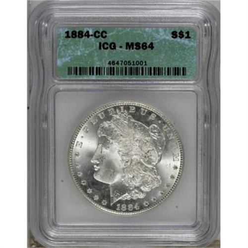 <B>1884-CC $1 MS64 ICG.</B></I> NGC Census: (5681/4108). PCGS Population (11832/7391). Mintage: 1,136,000. Numismedia Wsl. Price for NGC/PCGS coin in MS64: $200. (#7152)<BR><BR><B>Coin Engraver:</B> George T. Morgan<BR><BR><b>Shipping:</b> Coins & Currency (<a target="_blank" href="http://www.heritageauctions.com/common/shipping.php">view shipping information</a>)