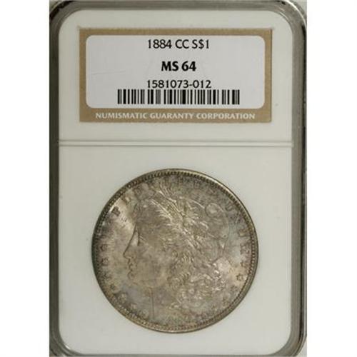 <B>1884-CC $1 MS64 NGC.</B></I> NGC Census: (5449/4018). PCGS Population (11645/7221). Mintage: 1,136,000. Numismedia Wsl. Price for NGC/PCGS coin in MS64: $196. (#7152)<BR><BR><B>Coin Engraver:</B> George T. Morgan<BR><BR><b>Shipping:</b> Coins & Currency (<a target="_blank" href="http://www.heritageauctions.com/common/shipping.php">view shipping information</a>)