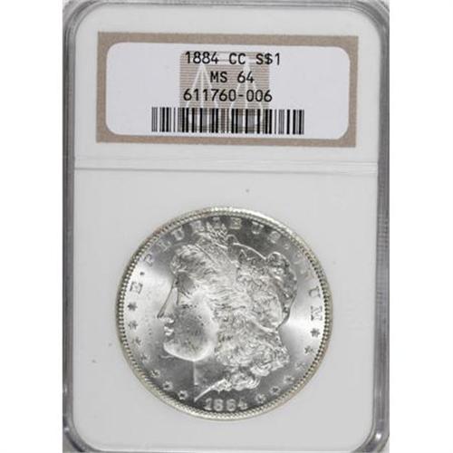 <B>1884-CC $1 MS64 NGC.</B></I> NGC Census: (5449/4018). PCGS Population (11639/7216). Mintage: 1,136,000. Numismedia Wsl. Price for NGC/PCGS coin in MS64: $196. (#7152)<BR><BR><B>Coin Engraver:</B> George T. Morgan<BR><BR><b>Shipping:</b> Coins & Currency (<a target="_blank" href="http://www.heritageauctions.com/common/shipping.php">view shipping information</a>)