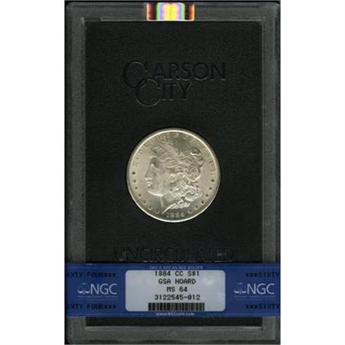 <B>1884-CC $1 MS64 NGC.</B></I> The Box and Certificate of Issue are included.<BR>NGC Census: (5566/4061). PCGS Population (11753/7324). Mintage: 1,136,000. Numismedia Wsl. Price for NGC/PCGS coin in MS64: $196. (#7152)<BR><BR><B>Coin Engraver:</B> George T. Morgan<BR><BR><b>Shipping:</b> Coins & Currency (<a target="_blank" href="http://www.heritageauctions.com/common/shipping.php">view shipping information</a>)