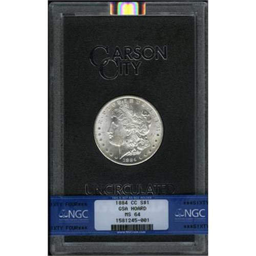 <B>1884-CC $1 MS64 NGC.</B></I> The Box and Certificate of Issue are included.<BR>NGC Census: (5566/4061). PCGS Population (11753/7324). Mintage: 1,136,000. Numismedia Wsl. Price for NGC/PCGS coin in MS64: $196. (#7152)<BR><BR><B>Coin Engraver:</B> George T. Morgan<BR><BR><b>Shipping:</b> Coins & Currency (<a target="_blank" href="http://www.heritageauctions.com/common/shipping.php">view shipping information</a>)