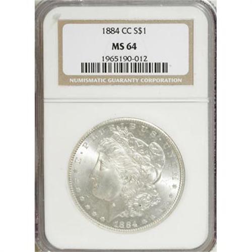 <B>1884-CC $1 MS64 NGC.</B></I> . NGC Census: (5642/4116). PCGS Population (11792/7356). Mintage: 1,136,000. Numismedia Wsl. Price for NGC/PCGS coin in MS64: $200. (#7152)<BR><BR><B>Coin Engraver:</B> George T. Morgan<BR><BR><b>Shipping:</b> Coins & Currency (<a target="_blank" href="http://www.heritageauctions.com/common/shipping.php">view shipping information</a>)