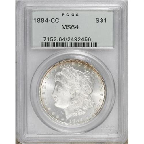 <B>1884-CC $1 MS64 PCGS.</B></I> PCGS Population (11733/7306). NGC Census: (5559/4057). Mintage: 1,136,000. Numismedia Wsl. Price for NGC/PCGS coin in MS64: $196. (#7152)<BR><BR><B>Coin Engraver:</B> George T. Morgan<BR><BR><b>Shipping:</b> Coins & Currency (<a target="_blank" href="http://www.heritageauctions.com/common/shipping.php">view shipping information</a>)