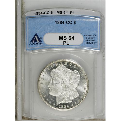 <B>1884-CC $1 MS64 Prooflike ANACS.</B></I> NGC Census: (1152/512). PCGS Population (1053/495). Numismedia Wsl. Price for NGC/PCGS coin in MS64: $240. (#7153)<BR><BR><b>Shipping:</b> Coins & Currency (<a target="_blank" href="http://www.heritageauctions.com/common/shipping.php">view shipping information</a>)