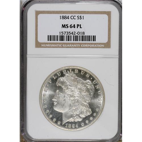 <B>1884-CC $1 MS64 Prooflike NGC.</B></I> NGC Census: (1152/512). PCGS Population (1053/495). Numismedia Wsl. Price for NGC/PCGS coin in MS64: $240. (#7153)<BR><BR><b>Shipping:</b> Coins & Currency (<a target="_blank" href="http://www.heritageauctions.com/common/shipping.php">view shipping information</a>)