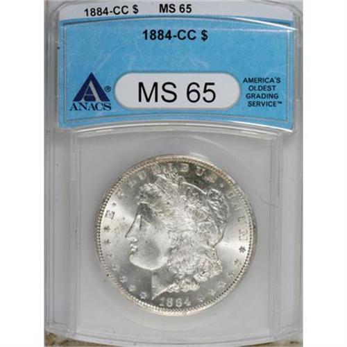 <B>1884-CC $1 MS65 ANACS.</B></I> NGC Census: (3309/663). PCGS Population (5871/1296). Mintage: 1,136,000. Numismedia Wsl. Price for NGC/PCGS coin in MS65: $340. (#7152)<BR><BR><B>Coin Engraver:</B> George T. Morgan<BR><BR><b>Shipping:</b> Coins & Currency (<a target="_blank" href="http://www.heritageauctions.com/common/shipping.php">view shipping information</a>\)