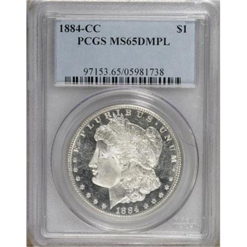 <B>1884-CC $1 MS65 Deep Mirror Prooflike PCGS.</B></I> The devices are thickly frosted, and the fields are prominently mirrored. A white-on-black Carson City dollar with immense eye appeal. Crisply struck and clean overall with a small patch of thin marks above the arrowheads.<BR><BR><b>Shipping:</b> Coins & Currency (<a target="_blank" href="http://www.heritageauctions.com/common/shipping.php">view shipping information</a>)