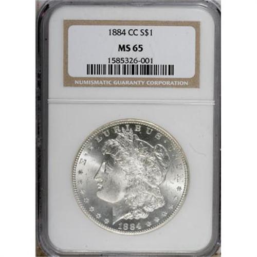 <B>1884-CC $1 MS65 NGC.</B></I> NGC Census: (3322/677). PCGS Population (5895/1310). Mintage: 1,136,000. Numismedia Wsl. Price for NGC/PCGS coin in MS65: $340. (#7152)<BR><BR><B>Coin Engraver:</B> George T. Morgan<BR><BR><b>Shipping:</b> Coins & Currency (<a target="_blank" href="http://www.heritageauctions.com/common/shipping.php">view shipping information</a>)