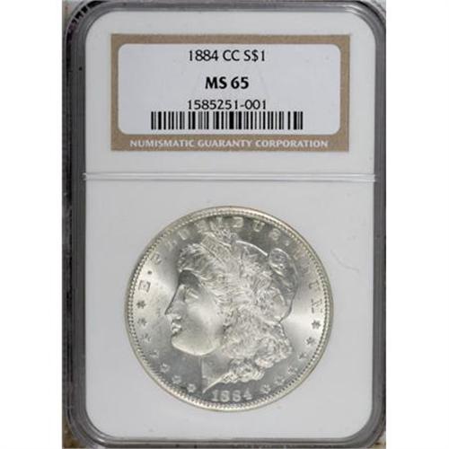 <B>1884-CC $1 MS65 NGC.</B></I> NGC Census: (3322/677). PCGS Population (5895/1310). Mintage: 1,136,000. Numismedia Wsl. Price for NGC/PCGS coin in MS65: $340. (#7152)<BR><BR><B>Coin Engraver:</B> George T. Morgan<BR><BR><b>Shipping:</b> Coins & Currency (<a target="_blank" href="http://www.heritageauctions.com/common/shipping.php">view shipping information</a>)