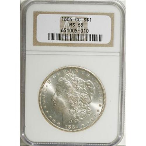 <B>1884-CC $1 MS65 NGC.</B></I> NGC Census: (3339/679). PCGS Population (5951/1327). Mintage: 1,136,000. Numismedia Wsl. Price for NGC/PCGS coin in MS65: $340. (#7152)<BR><BR><B>Coin Engraver:</B> George T. Morgan<BR><BR><b>Shipping:</b> Coins & Currency (<a target="_blank" href="http://www.heritageauctions.com/common/shipping.php">view shipping information</a>)