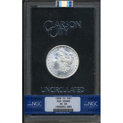 <B>1884-CC $1 MS65 NGC.</B></I> GSA box included. NGC Census: (3370/687). PCGS Population (5973/1333). Mintage: 1,136,000. Numismedia Wsl. Price for NGC/PCGS coin in MS65: $340. (#7152)<BR><BR><B>Coin Engraver:</B> George T. Morgan<BR><BR><b>Shipping:</b> Coins & Currency (<a target="_blank" href="http://www.heritageauctions.com/common/shipping.php">view shipping information</a>)