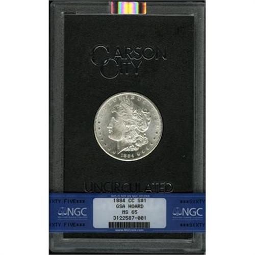 <B>1884-CC $1 MS65 NGC.</B></I> The Box and Certificate of Issue are included.<BR>NGC Census: (3384/695). PCGS Population (5989/1345). Mintage: 1,136,000. Numismedia Wsl. Price for NGC/PCGS coin in MS65: $330. (#7152)<BR><BR><B>Coin Engraver:</B> George T. Morgan<BR><BR><b>Shipping:</b> Coins & Currency (<a target="_blank" href="http://www.heritageauctions.com/common/shipping.php">view shipping information</a>)