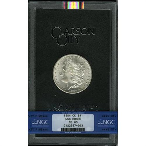 <B>1884-CC $1 MS65 NGC.</B></I> The Box and Certificate of Issue are included.<BR>NGC Census: (3384/695). PCGS Population (5989/1345). Mintage: 1,136,000. Numismedia Wsl. Price for NGC/PCGS coin in MS65: $330. (#7152)<BR><BR><B>Coin Engraver:</B> George T. Morgan<BR><BR><b>Shipping:</b> Coins & Currency (<a target="_blank" href="http://www.heritageauctions.com/common/shipping.php">view shipping information</a>)
