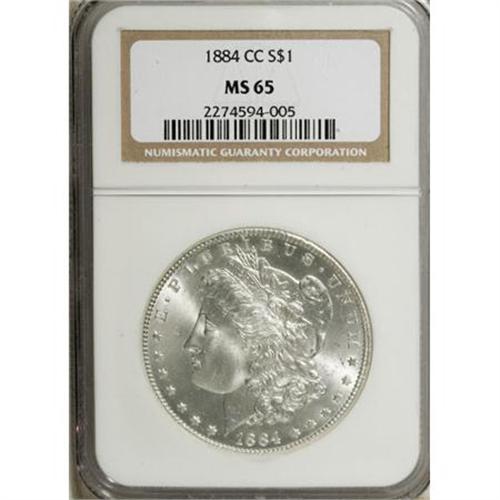 <B>1884-CC $1 MS65 NGC.</B></I> NGC Census: (3404/713). PCGS Population (6018/1354). Mintage: 1,136,000. Numismedia Wsl. Price for NGC/PCGS coin in MS65: $330. (#7152)<BR><BR><B>Coin Engraver:</B> George T. Morgan<BR><BR><b>Shipping:</b> Coins & Currency (<a target="_blank" href="http://www.heritageauctions.com/common/shipping.php">view shipping information</a>)
