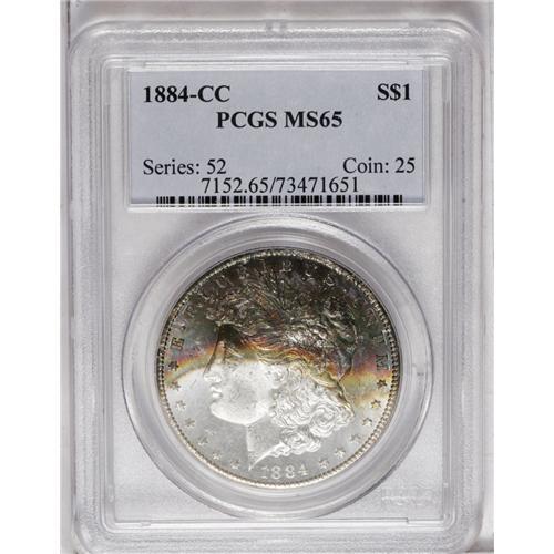1884-CC $1 MS65 PCGS. Generous sea-green, ruby-red, an