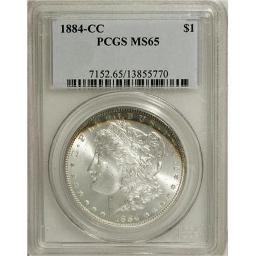 <B>1884-CC $1 MS65 PCGS.</B></I> PCGS Population (5896/1309). NGC Census: (3315/670). Mintage: 1,136,000. Numismedia Wsl. Price for NGC/PCGS coin in MS65: $340. (#7152)<BR><BR><B>Coin Engraver:</B> George T. Morgan<BR><BR><b>Shipping:</b> Coins & Currency (<a target="_blank" href="http://www.heritageauctions.com/common/shipping.php">view shipping information</a>\)