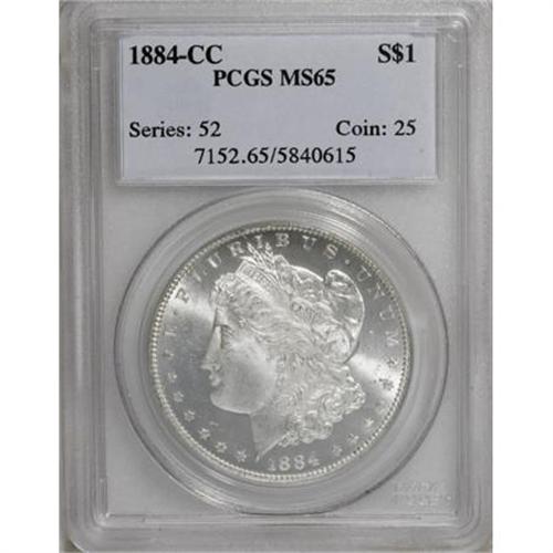 <B>1884-CC $1 MS65 PCGS.</B></I> PCGS Population (5896/1309). NGC Census: (3315/670). Mintage: 1,136,000. Numismedia Wsl. Price for NGC/PCGS coin in MS65: $340. (#7152)<BR><BR><B>Coin Engraver:</B> George T. Morgan<BR><BR><b>Shipping:</b> Coins & Currency (<a target="_blank" href="http://www.heritageauctions.com/common/shipping.php">view shipping information</a>\)
