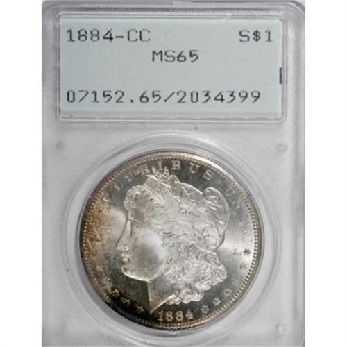 <B>1884-CC $1 MS65 PCGS.</B></I> PCGS Population (5896/1310). NGC Census: (3322/677). Mintage: 1,136,000. Numismedia Wsl. Price for NGC/PCGS coin in MS65: $340. (#7152)<BR><BR><B>Coin Engraver:</B> George T. Morgan<BR><BR><b>Shipping:</b> Coins & Currency (<a target="_blank" href="http://www.heritageauctions.com/common/shipping.php">view shipping information</a>)