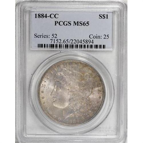 <B>1884-CC $1 MS65 PCGS.</B></I> PCGS Population (5951/1327). NGC Census: (3339/679). Mintage: 1,136,000. Numismedia Wsl. Price for NGC/PCGS coin in MS65: $340. (#7152)<BR><BR><B>Coin Engraver:</B> George T. Morgan<BR><BR><b>Shipping:</b> Coins & Currency (<a target="_blank" href="http://www.heritageauctions.com/common/shipping.php">view shipping information</a>)