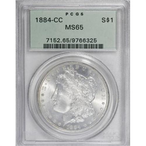 <B>1884-CC $1 MS65 PCGS.</B></I> PCGS Population (5989/1345). NGC Census: (3382/693). Mintage: 1,136,000. Numismedia Wsl. Price for NGC/PCGS coin in MS65: $330. (#7152)<BR><BR><B>Coin Engraver:</B> George T. Morgan<BR><BR><b>Shipping:</b> Coins & Currency (<a target="_blank" href="http://www.heritageauctions.com/common/shipping.php">view shipping information</a>)