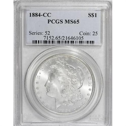 <B>1884-CC $1 MS65 PCGS.</B></I> . PCGS Population (6004/1352). NGC Census: (3403/713). Mintage: 1,136,000. Numismedia Wsl. Price for NGC/PCGS coin in MS65: $330. (#7152)<BR><BR><B>Coin Engraver:</B> George T. Morgan<BR><BR><b>Shipping:</b> Coins & Currency (<a target="_blank" href="http://www.heritageauctions.com/common/shipping.php">view shipping information</a>)