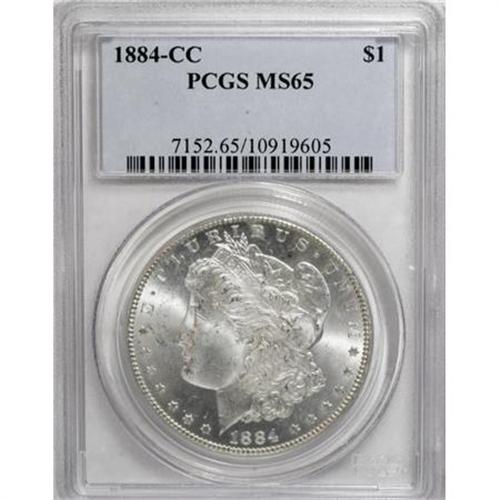 <B>1884-CC $1 MS65 PCGS.</B></I> PCGS Population (6037/1355). NGC Census: (3402/710). Mintage: 1,136,000. Numismedia Wsl. Price for NGC/PCGS coin in MS65: $330. (#7152)<BR><BR><B>Coin Engraver:</B> George T. Morgan<BR><BR><b>Shipping:</b> Coins & Currency (<a target="_blank" href="http://www.heritageauctions.com/common/shipping.php">view shipping information</a>)