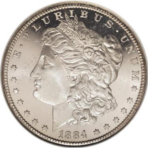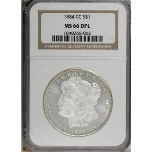 <B>1884-CC $1 MS66 Deep Mirror Prooflike NGC.</B></I> VAM-7. A remarkable DMPL Carson City dollar. The devices are thickly frosted, and exhibit unimprovable white-on-black contrast with the glassy fields. The strike is precise, although the eagle displays minor mint-made granularity from a rusted or improperly prepared reverse die. The 18 in the date is recut.<BR><BR><b>Shipping:</b> Coins & Currency (<a target="_blank" href="http://www.heritageauctions.com/common/shipping.php">view shipping information</a>)