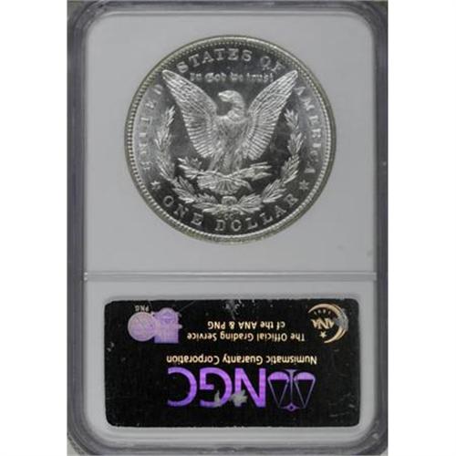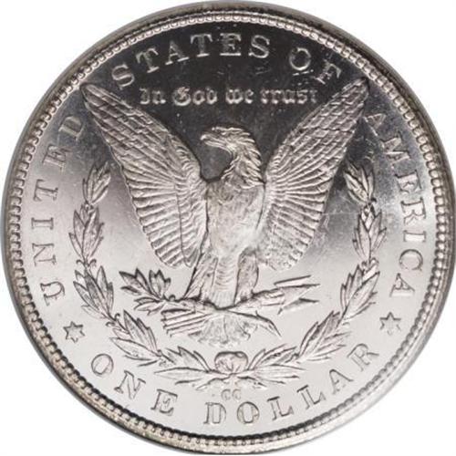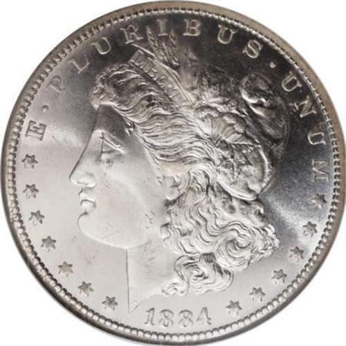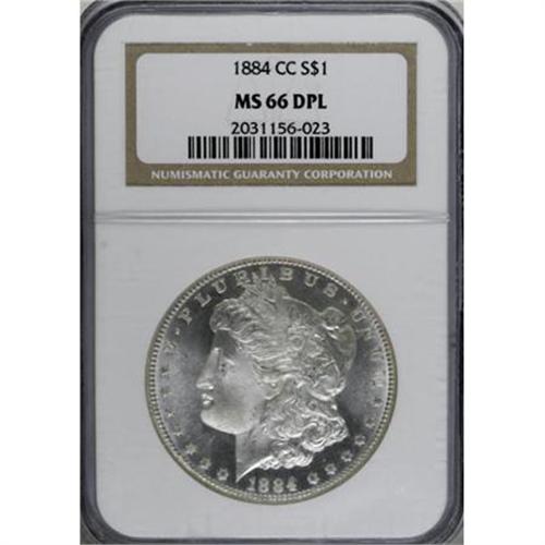 <B>1884-CC $1 MS66 Deep Mirror Prooflike NGC.</B></I> The 1884-CC dollar in DMPL is readily available in Mint State grades, but starts to become scarce at the Premium Gem level. As of August 2007, NGC has seen only 39 specimens, and a mere three finer. The MS66 coin we present here displays sharply struck design elements, though the hair above Liberty's ear is soft. The deep mirror fields establish a strong contrast with the motifs. A touch or two of faint tan color visits Liberty's cheek and the lower left obverse quadrant, otherwise the coin can be considered brilliant. A few minor marks on Liberty's cheek and neck are not bothersome.<BR><BR><b>Shipping:</b> Coins & Currency (<a target="_blank" href="http://www.heritageauctions.com/common/shipping.php">view shipping information</a>)