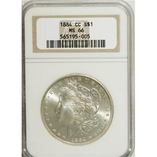 <B>1884-CC $1 MS66 NGC.</B></I> Well-defined with sharp detail on the hair over Liberty's ear and on the eagle's breast feathers. Its highly lustrous surfaces are essentially untoned and possess just a few minuscule obverse marks. A light die crack encircles the margins on each side. An attractive example of this popular Carson City issue.<BR><BR><B>Coin Engraver:</B> George T. Morgan<BR><BR><b>Shipping:</b> Coins & Currency (<a target="_blank" href="http://www.heritageauctions.com/common/shipping.php">view shipping information</a>)
