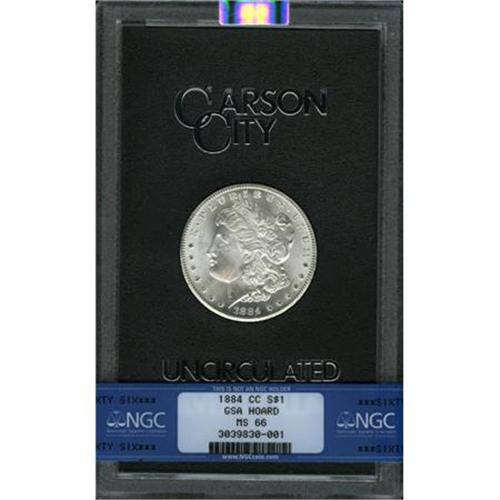 <B>1884-CC $1 MS66 NGC.</B></I> An exciting Carson City dollar from the GSA Hoard, with smoldering satiny luster and a near total absence of abrasions. The strike is strong, as is the eye appeal. With original GSA black box of issue and COA.<BR><I>From The Leroy Van Allen Collection.</B></I><BR><BR><B>Coin Engraver:</B> George T. Morgan<BR><BR><b>Shipping:</b> Coins & Currency (<a target="_blank" href="http://www.heritageauctions.com/common/shipping.php">view shipping information</a>)