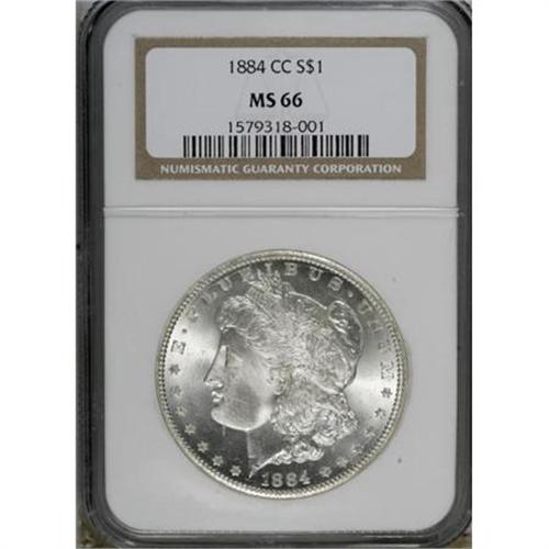 <B>1884-CC $1 MS66 NGC.</B></I> Intensely lustrous and essentially untoned, with spindly peripheral die cracks on each side, and faint roller marks noted on Liberty's jaw. Sharply struck and impressively preserved, with just a few trivial obverse marks that prevent an even loftier grade.<BR><BR><B>Coin Engraver:</B> George T. Morgan<BR><BR><b>Shipping:</b> Coins & Currency (<a target="_blank" href="http://www.heritageauctions.com/common/shipping.php">view shipping information</a>)