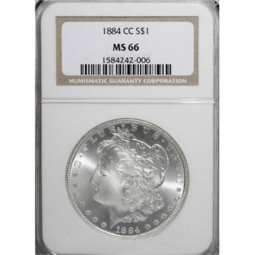 <B>1884-CC $1 MS66 NGC.</B></I> NGC Census: (631/79). PCGS Population (1295/57). Mintage: 1,136,000. Numismedia Wsl. Price for NGC/PCGS coin in MS66: $710. (#7152)<BR><BR><B>Coin Engraver:</B> George T. Morgan<BR><BR><b>Shipping:</b> Coins & Currency (<a target="_blank" href="http://www.heritageauctions.com/common/shipping.php">view shipping information</a>)