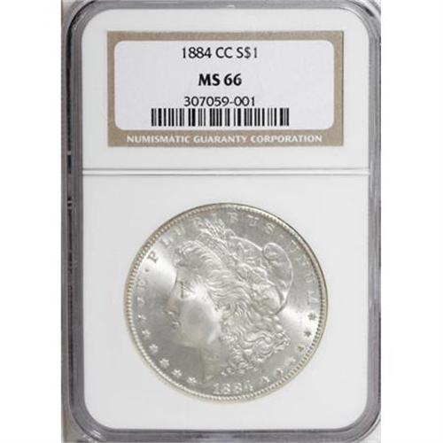 <B>1884-CC $1 MS66 NGC.</B></I> Highly appealing with frosty and brilliant silver luster in addition to sharp design features. A few light grazes are in concert with the grade designation.<BR><I>From The Silver Spur Collection of Morgan Dollars.</B></I><BR><BR><B>Coin Engraver:</B> George T. Morgan<BR><BR><b>Shipping:</b> Coins & Currency (<a target="_blank" href="http://www.heritageauctions.com/common/shipping.php">view shipping information</a>)