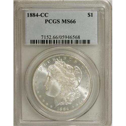 <B>1884-CC $1 MS66 PCGS.</B></I> A lovely Carson City Premium Gem. The surfaces show thick mint frost with semi-prooflike fields. Fully struck and highly attractive.<BR><BR><B>Coin Engraver:</B> George T. Morgan<BR><BR><b>Shipping:</b> Coins & Currency (<a target="_blank" href="http://www.heritageauctions.com/common/shipping.php">view shipping information</a>)