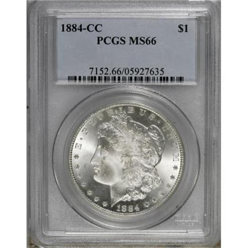 <B>1884-CC $1 MS66 PCGS.</B></I> Strongly lustrous with occasional wisps of silver-gray patina in the fields. The central devices offer bold detail and exquisite preservation. PCGS has certified 57 finer pieces (1/08).<BR><BR><B>Coin Engraver:</B> George T. Morgan<BR><BR><b>Shipping:</b> Coins & Currency (<a target="_blank" href="http://www.heritageauctions.com/common/shipping.php">view shipping information</a>)