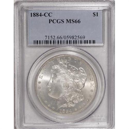 <B>1884-CC $1 MS66 PCGS.</B></I> VAM-2. The later die state of this repunched date VAM with a heavy die crack along the base of the date. This highly lustrous and sharply struck Premium Gem has pleasing preservation and good eye appeal.<BR><BR><B>Coin Engraver:</B> George T. Morgan<BR><BR><b>Shipping:</b> Coins & Currency (<a target="_blank" href="http://www.heritageauctions.com/common/shipping.php">view shipping information</a>)
