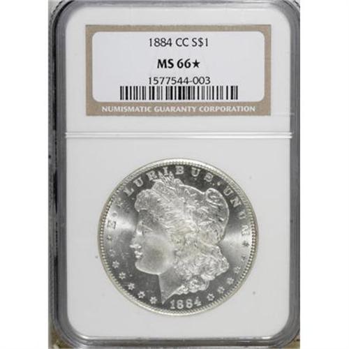 <B>1884-CC $1 MS66 <img src="/images/star.gif" width="10" height="10" alt="" border="0"> NGC.</B></I> The flashy fields provide exemplary luster, and the strike is crisp with only a trace of blending at the centers. Close to brilliant, although the portrait has a wisp of golden toning. A gorgeously preserved Carson City type coin.<BR><BR><B>Coin Engraver:</B> George T. Morgan<BR><BR><b>Shipping:</b> Coins & Currency (<a target="_blank" href="http://www.heritageauctions.com/common/shipping.php">view shipping information</a>)