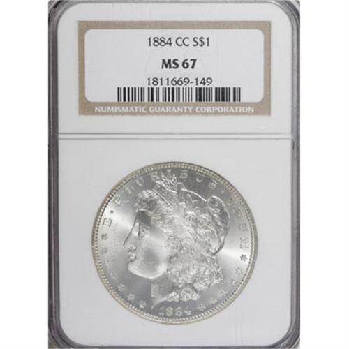 <B>1884-CC $1 MS67 NGC.</B></I> Most of the 1.1 million-piece mintage survived in Uncirculated grades, and the last were finally distributed as part of the GSA holdings in the late 1970s. This is a fully struck example that shows none of the often-seen prooflike finish. Rather, the coin has even, thick mint frost over each side. Brilliant, the surfaces are nearly free from post-striking impairments of any size. Census: 75 in 67, 0 finer (6/07).<BR><I>From the Reuben Reinstein Collection.</B></I><BR><BR><b>Shipping:</b> Coins & Currency (<a target="_blank" href="http://www.heritageauctions.com/common/shipping.php">view shipping information</a>)