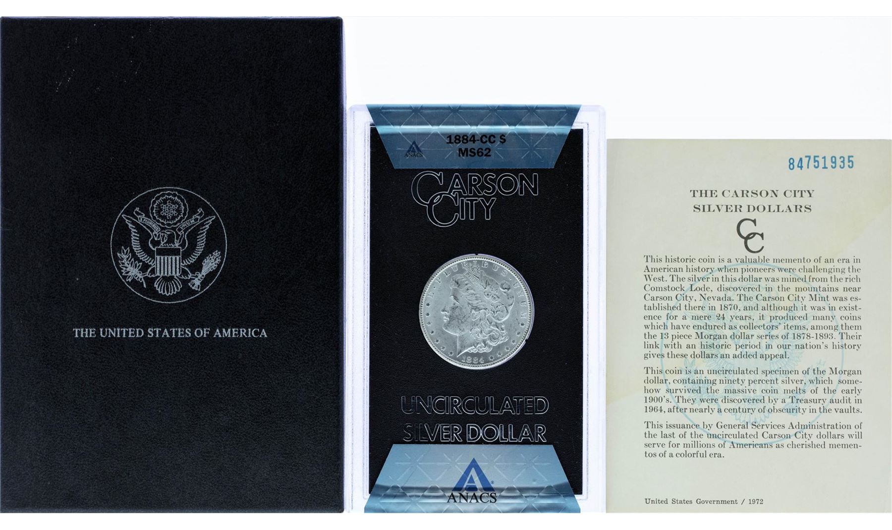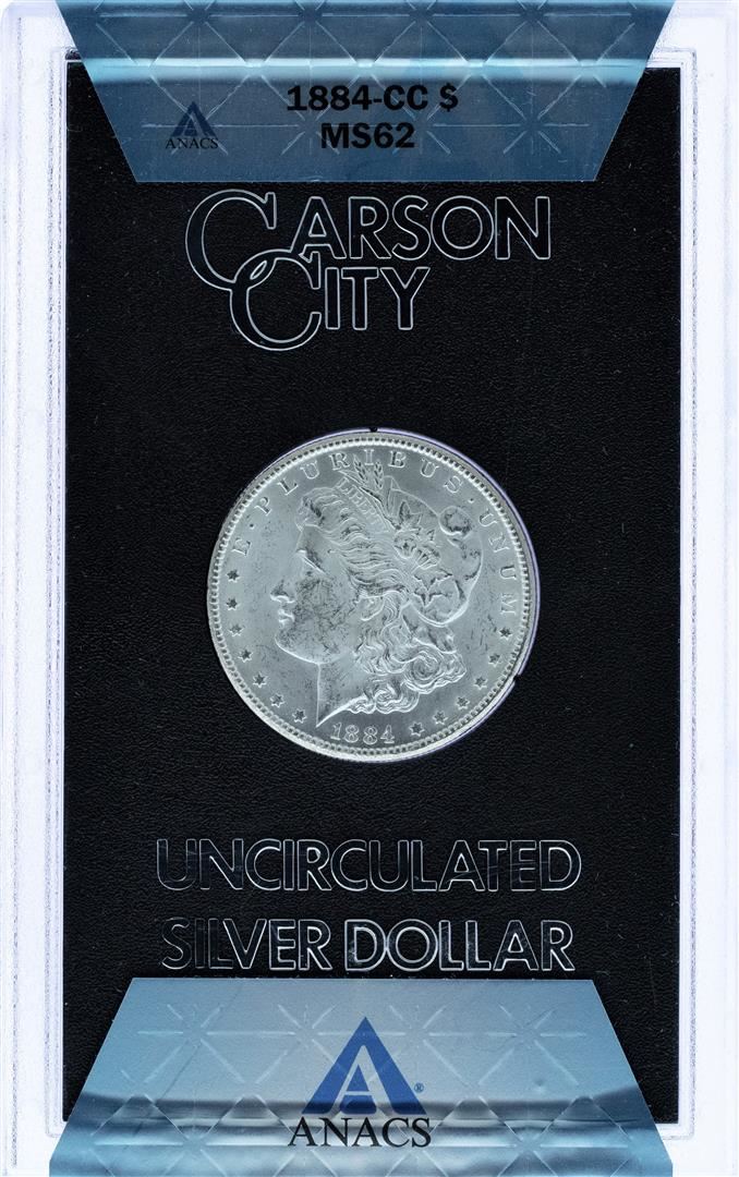 One 1884-CC $1 Morgan Silver Dollar Coin ANACS MS62 GSA w/ Box & COA. ANACS Certified.
