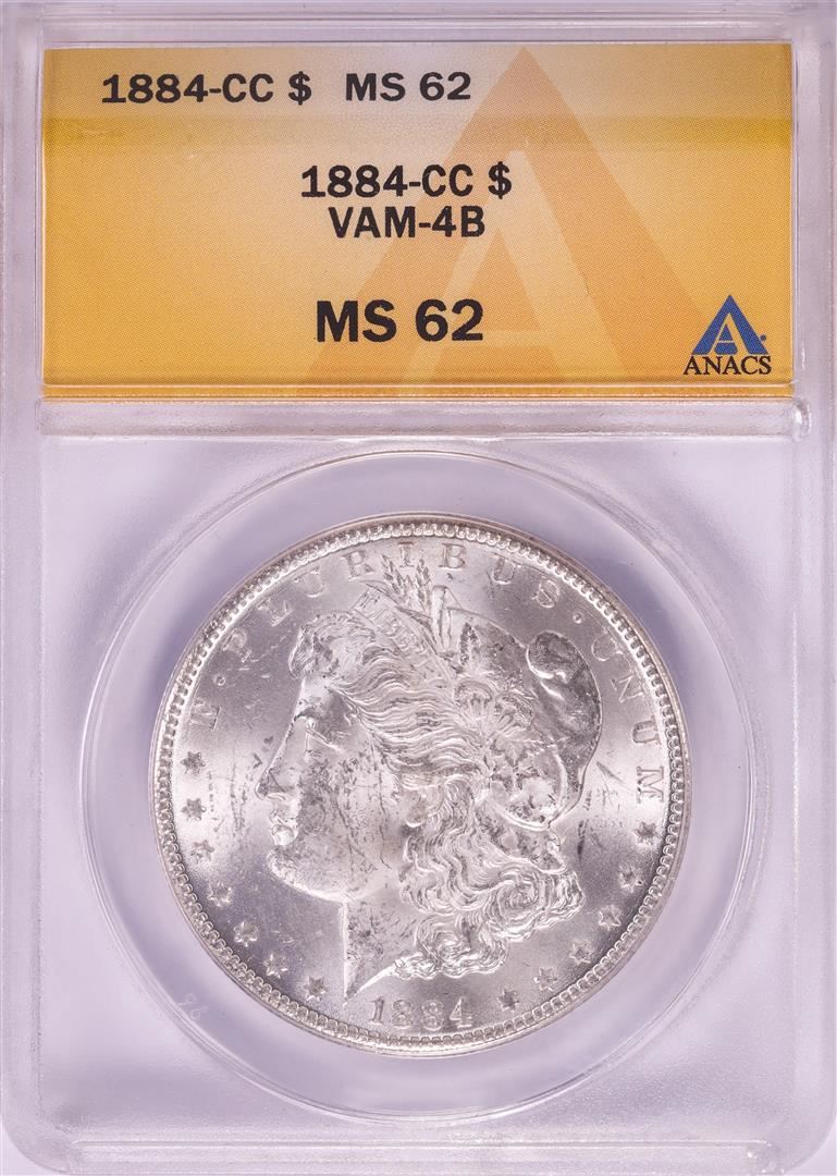 One 1884-CC $1 Morgan Silver Dollar Coin ANACS MS62 VAM-4B. ANACS Certified.