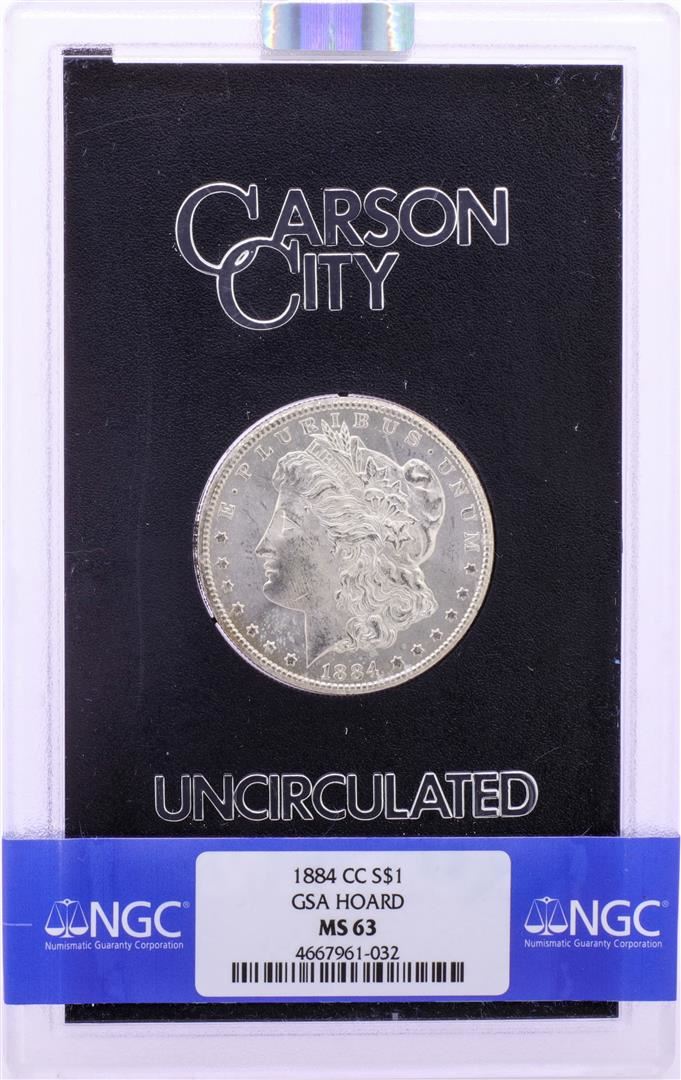 One 1884-CC $1 Morgan Silver Dollar Coin GSA Hoard Uncirculated NGC MS63 w/Box & COA. NGC Certified.
