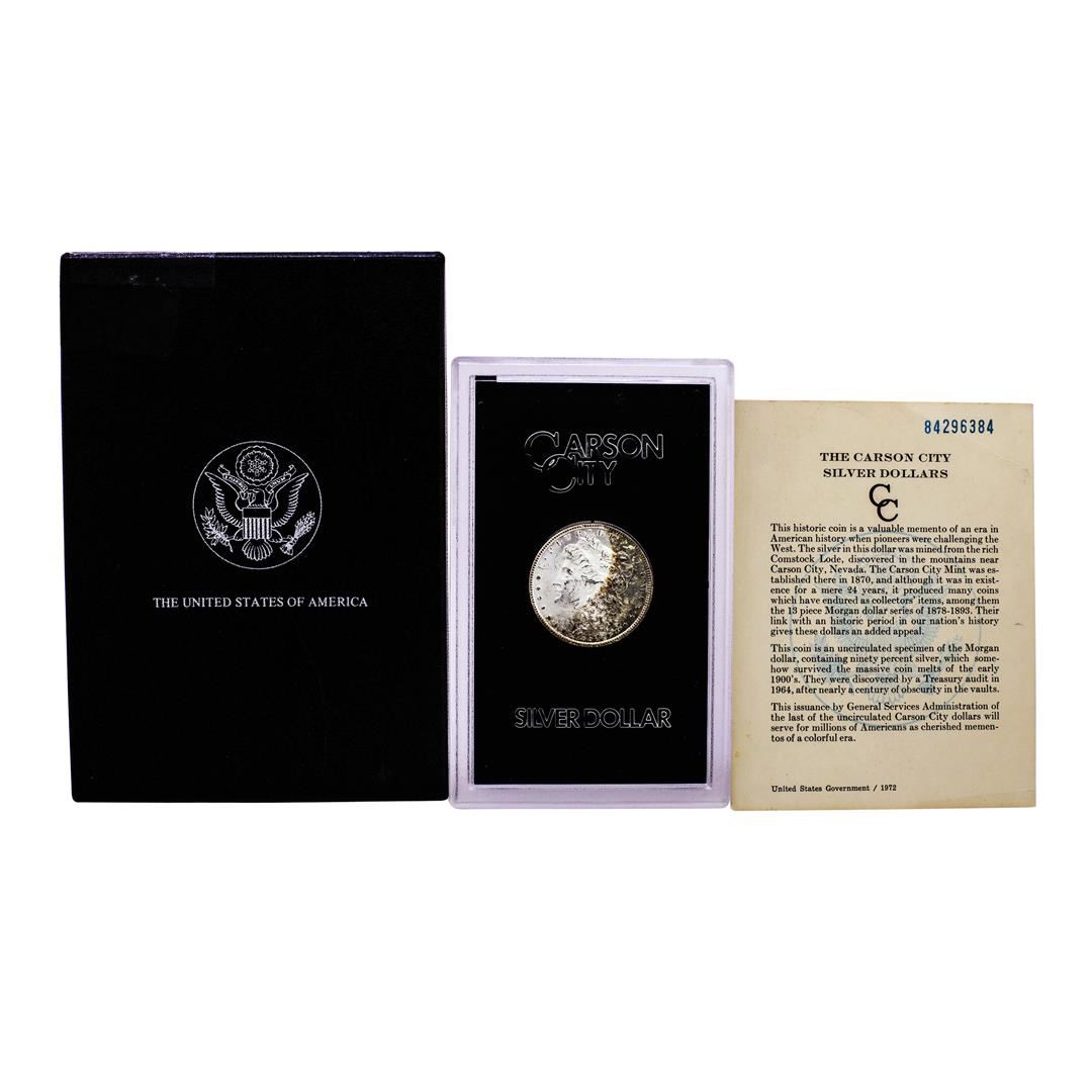 One 1884-CC $1 Morgan Silver Dollar Coin GSA Hoard Uncirculated w/Box & COA Nice Toning.