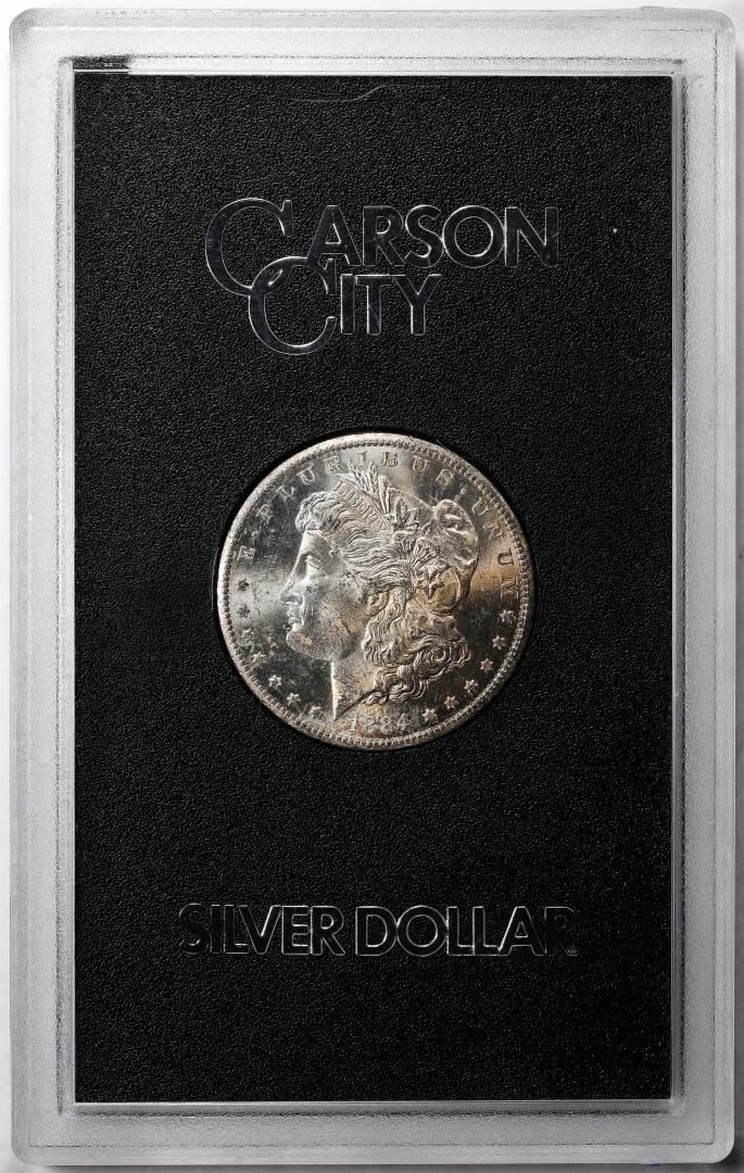 One 1884-CC $1 Morgan Silver Dollar Coin GSA Hoard Uncirculated w/Box & COA Toning.